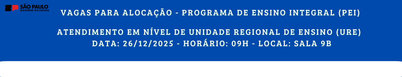 <<>> NOTÍCIASURE Araçatuba realiza transferências, alocação e realocação de professores do PEI 2025/2026Nesta terça-feira (16/12), a Unidade Regional de Ensino (URE) de Araçatuba está realizando a etapa de … Leia mais »Professores da URE Araçatuba recebem o Prêmio Multiplica Melhores PráticasA professora multiplicadora Juliana Cândida Batista Gomes Coelho (E.E. Manoel Bento da Cruz) e os professores … Leia mais »Trilha da Educação Antirracista da URE Araçatuba recebe prêmioA Unidade Regional de Ensino (URE) de Araçatuba recebeu o troféu “Mapa do Bem”, pela realização … Leia mais »Reforma na E. E. Manoel Bento da Cruz é concluídaEstudantes, professores, equipe gestora e demais funcionários da E. E. Manoel Bento da Cruz, em Araçatuba, … Leia mais »Almoço nas férias: nutricionista da URE Araçatuba concede entrevista ao vivo para TVDurante o recesso, as escolas estaduais estarão abertas para oferecer refeições aos seus estudantes, de segunda … Leia mais »Subsecretário da SUPLAN e diretora da DIMAV visitam a URE AraçatubaMichel Minerbo e Janaína Magro, respectivamente o subsecretário da Subsecretaria de Planejamento da Rede Escolar (SUPLAN) … Leia mais »EDITAISCEEJA 2026 – Edital e ClassificaçãoCEEJA 2026 – Edital e Classificação EDITAL Nº 01/2026 Leia mais »Veja o cronograma de etapas de movimentação, alocação e realocação de docentes … Leia mais »Resultado das entrevistas para vagas remanescentes para atuação junto às escolas PEI … Leia mais »Inscrições para entrevistas de docentes para atuação no PEI 2026 / vagas …A Chefe de de Departamento – Dirigente Regional de Ensino de Araçatuba em substituição torna público … Leia mais »Veja a Portaria DIPES nº 21 e o cronograma de atribuição Leia mais »Seleção de Diretor de Escola / Diretor EscolarPROCESSO SELETIVO DE DIRETOR DE ESCOLA /DIRETOR ESCOLAR EDITAL Nº 01/2026 O Chefe de de … Leia mais »