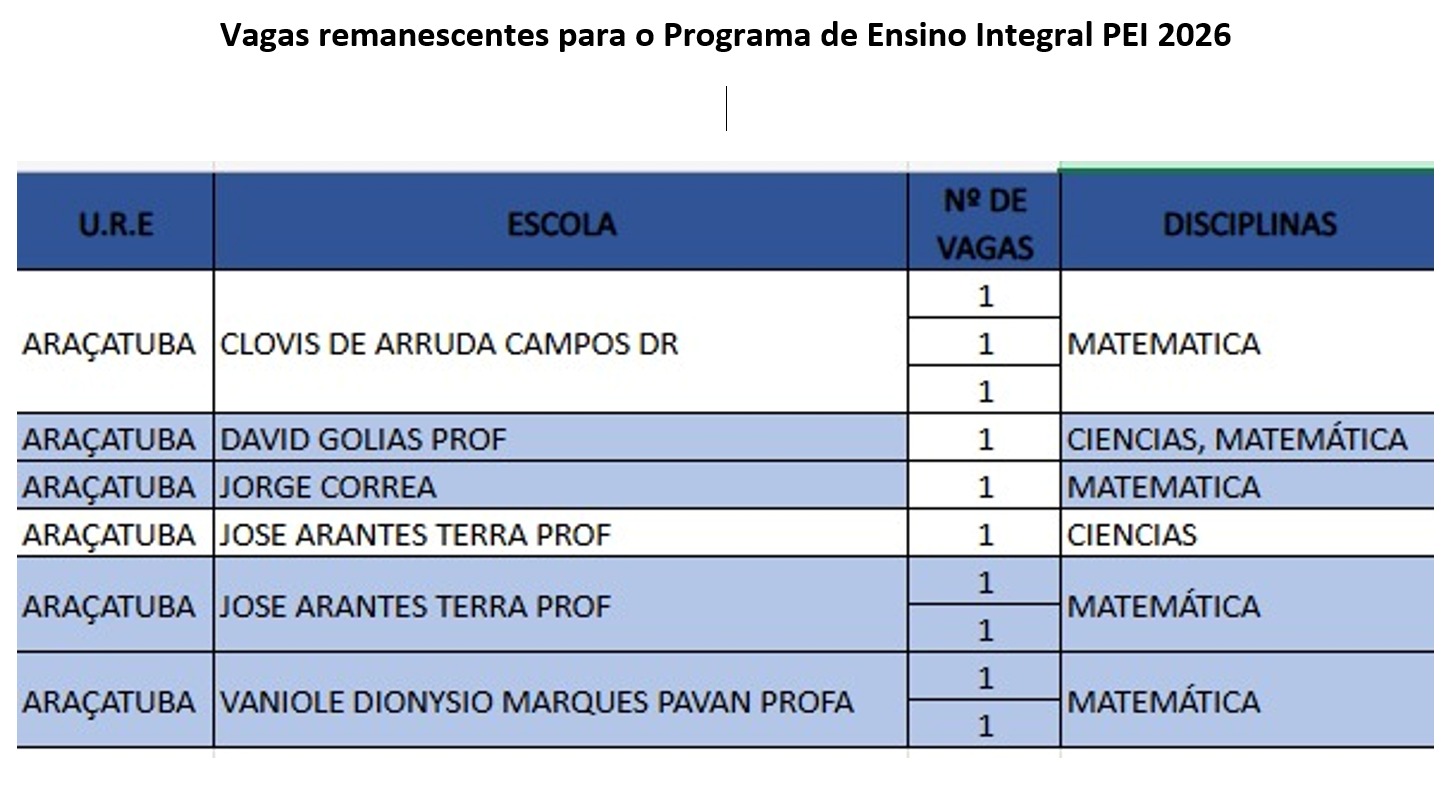 A Chefe de de Departamento – Dirigente Regional de Ensino de Araçatuba em substituição torna público o formulário de inscrições para entrevistas de docentes efetivos, nomeados, não efetivos (P, N, F), contratados e candidatos à contratação, devidamente credenciados (CONFIRA A LISTA AQUI), em conformidade com o inciso II do Artigo 1º da PORTARIA DIPES Nº 01 DE 05 DE JANEIRO DE 2026, que almejam fazer parte do Programa de Ensino Integral (PEI) em 2026 a partir das vagas remanescentes do processo de alocação inicial – 2026, nos termos da Resolução SEDUC nº 158, de 28 de novembro de 2025.